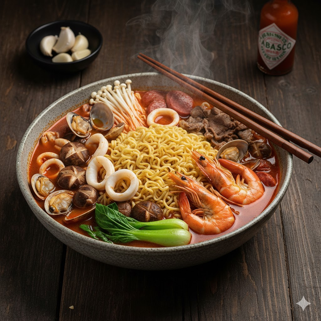 Cuối cùng, topping đa dạng khiến món ăn này trở nên hấp dẫn hơn. Một tô mì cay có thể kết hợp hải sản tươi như tôm, mực, bạch tuộc cùng thịt bò thái mỏng, xúc xích. Nếu muốn đậm chất Hàn Quốc hơn thì thêm kim chi; còn nếu thích biến tấu mới lạ thì có thể cho thêm phô mai để cân bằng vị cay. Chính sự kết hợp phong phú này tạo nên nét đặc trưng khó cưỡng của mì cay 7 cấp độ.